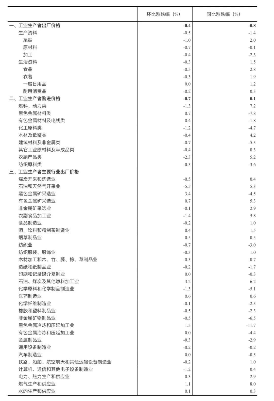 工業(yè)生產者購進價格中,燃料動力類價格上漲7.2%,農副產品類價格上漲5.2%;黑色金屬材料類價格下降7.8%,建筑材料及非金屬類價格下降5.3%,化工原料類價格下降4.7%,有色金屬材料及電線類價格下降1.8%。