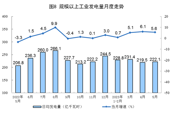 電力生產(chǎn)增速略有回落。5月份,發(fā)電6886億千瓦時(shí),同比增長(zhǎng)5.6%,增速比4月份回落0.5個(gè)百分點(diǎn),日均發(fā)電222.1億千瓦時(shí)。1—5月份,發(fā)電34216億千瓦時(shí),同比增長(zhǎng)3.9%。