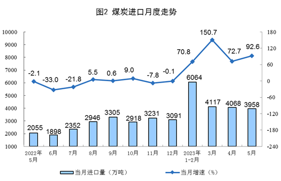 原煤生產(chǎn)保持穩(wěn)定,進(jìn)口持續(xù)高位增長(zhǎng)。5月份,生產(chǎn)原煤3.9億噸,同比增長(zhǎng)4.2%,增速比4月份放緩0.3個(gè)百分點(diǎn),日均產(chǎn)量1243萬(wàn)噸。進(jìn)口煤炭3958萬(wàn)噸,同比增長(zhǎng)92.6%,增速比4月份加快19.9個(gè)百分點(diǎn)。