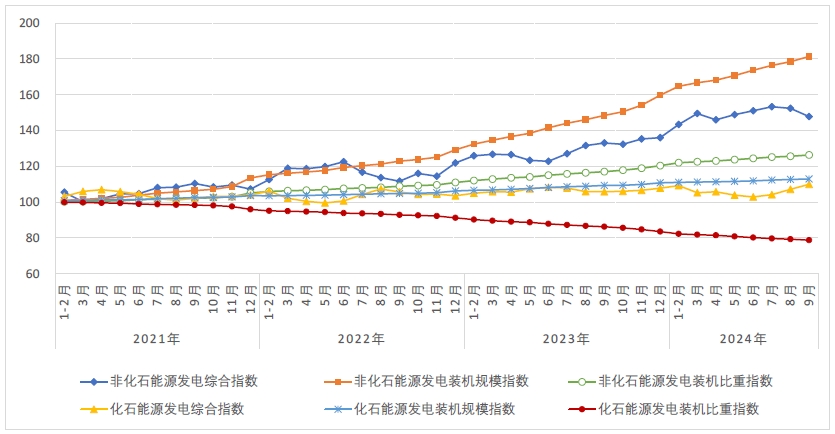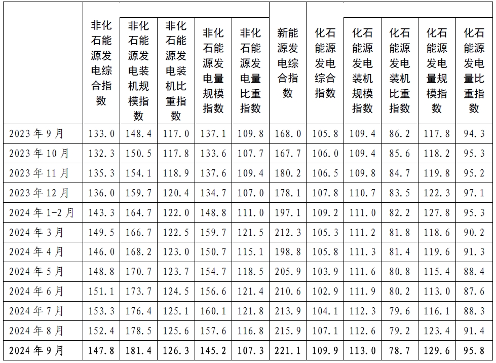 2024年9月,非化石能源發(fā)電綜合指數為147.8,比2020年基期增長了47.8%,同比增長11.1%;其中,新能源發(fā)電綜合指數為221.1,比2020年基期增長了121.1%,同比增長31.6%。在“雙碳”目標引領下,非化石能源發(fā)電綜合指數快速增長。其中: