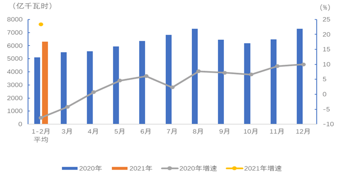 1-2月,全國全社會用電量12588億千瓦時(shí),同比增長22.2%。