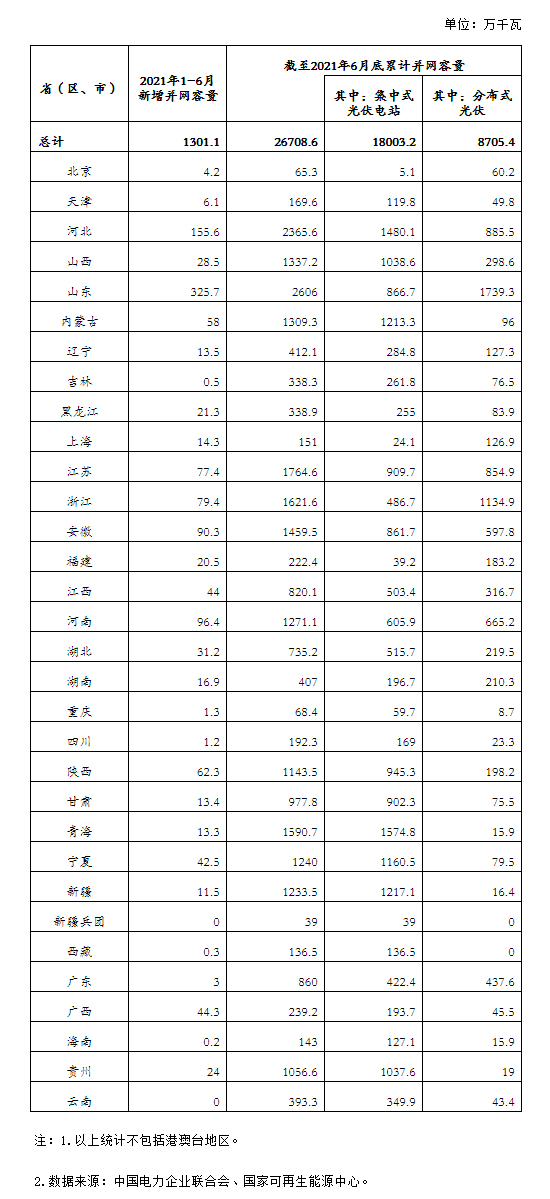 2021年上半年全國光伏發(fā)電建設(shè)運行情況