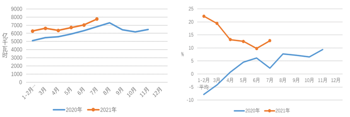 圖1 2020、2021年分月全社會(huì)用電量及其增速