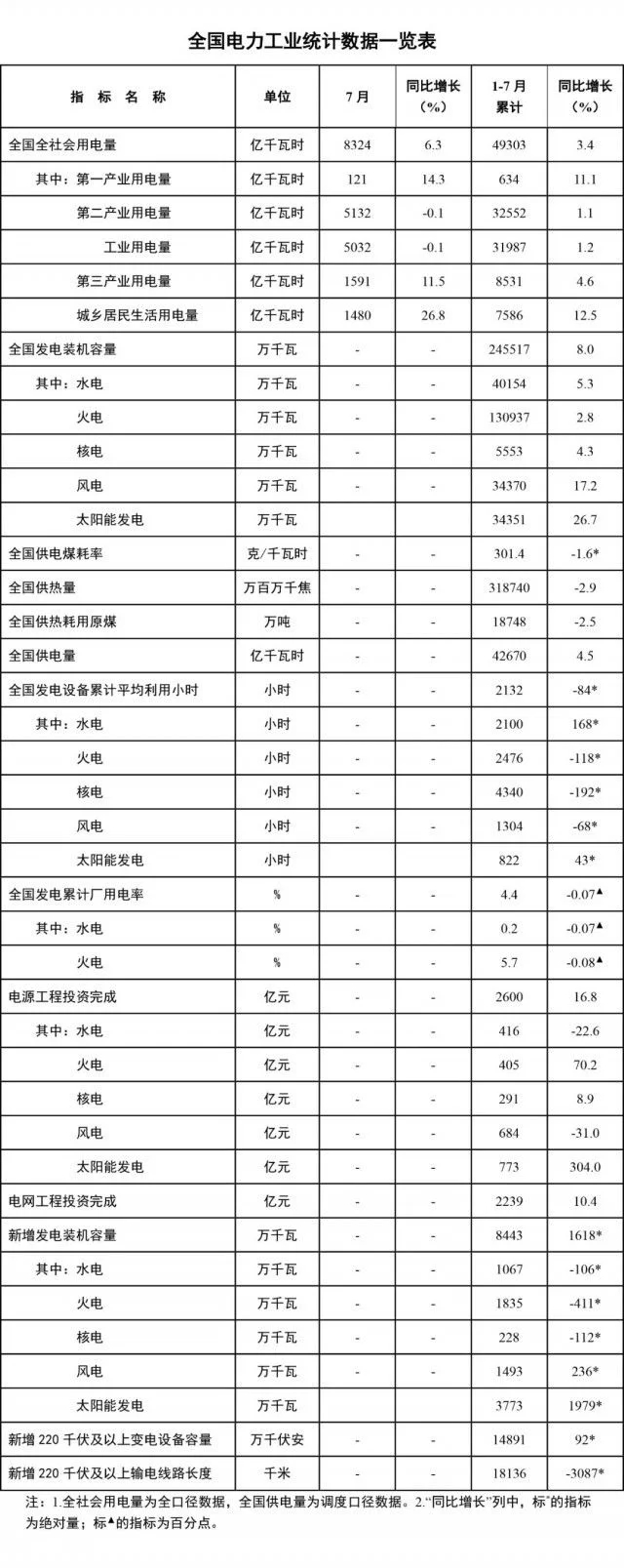 本網(wǎng)訊 8月19日,國(guó)家能源局發(fā)布1-7月份全國(guó)電力工業(yè)統(tǒng)計(jì)數(shù)據(jù)。截至7月底,全國(guó)發(fā)電裝機(jī)容量約24.6億千瓦,同比增長(zhǎng)8.0%。其中,風(fēng)電裝機(jī)容量約3.4億千瓦,同比增長(zhǎng)17.2%;太陽(yáng)能發(fā)電裝機(jī)容量約3.4億千瓦,同比增長(zhǎng)26.7%。