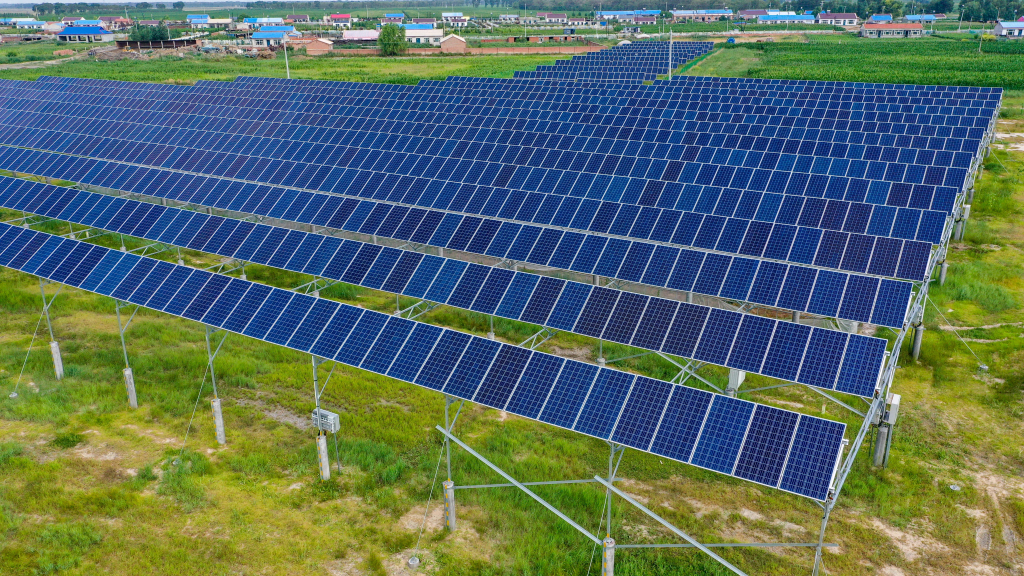 吉林省白城市鎮(zhèn)賚縣鎮(zhèn)賚鎮(zhèn)架其村的光伏設(shè)備(無人機(jī)照片)。新華社記者張楠 攝