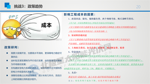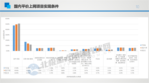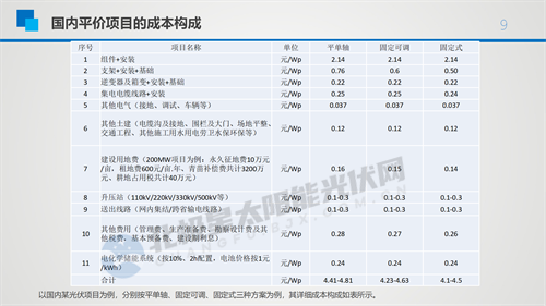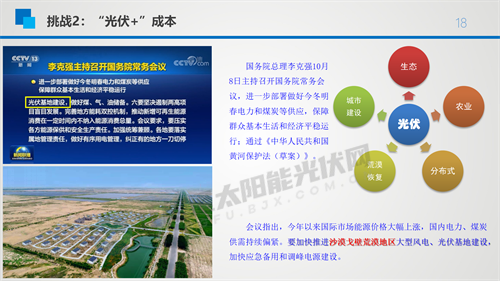 與往年不同的是,雖然我們在“十三五”期間也有系統(tǒng)成本和非系統(tǒng)成本的因素,但是今年光伏系統(tǒng)成本有逐漸上升的趨勢,如更高電壓等級(jí)的配電站建設(shè)費(fèi)用、跨省特高壓輸送中省內(nèi)發(fā)電設(shè)施建設(shè)費(fèi)用、配置儲(chǔ)能設(shè)施費(fèi)用等建設(shè)成本在不斷增加。更重要的是光伏組件的價(jià)格和安裝成本,目前組件成本占到系統(tǒng)成本的50%左右,所以組件價(jià)格還是決定這個(gè)項(xiàng)目生死非常關(guān)鍵的因素。