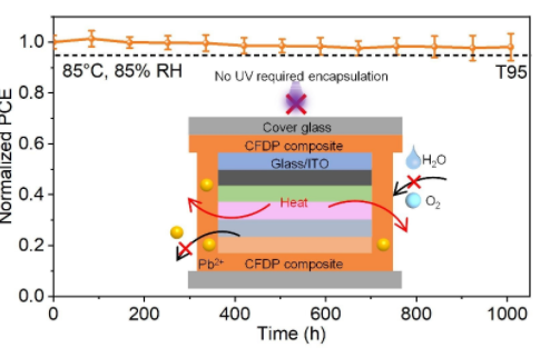 利用氟硅聚合物凝膠封裝的鈣鈦礦電池在高溫、高濕度(85℃、85%相對濕度)下運行1000小時,器件效率保持初始效率的98%,表現(xiàn)出了優(yōu)異的濕熱穩(wěn)定性。(西北工業(yè)大學材料學院納米能源中心供圖)