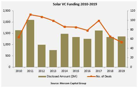 2019年太陽(yáng)能行業(yè)的全球風(fēng)險(xiǎn)投資和私募股權(quán)融資(VC / PE)共計(jì)53筆交易,達(dá)到14億美元,而2018年的65筆交易為13億美元。
