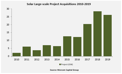 2019年,共有26吉瓦的大型太陽(yáng)能項(xiàng)目易手,而2018年為29吉瓦。2019年有192個(gè)大型太陽(yáng)能項(xiàng)目并購(gòu),而2018年為218個(gè)大型太陽(yáng)能項(xiàng)目。