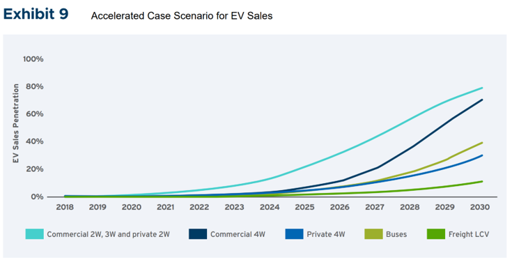 根據(jù)“加速情景”, 到2030年,電動汽車在新車銷售中的細分市場滲透率將達到私家車的30%、商用車的70%、公交車的40%以及兩輪和三輪車的80%。在“保守情景”中,預(yù)計2030年電動汽車在所有汽車細分市場的新銷量中的加權(quán)平均滲透率為35%。