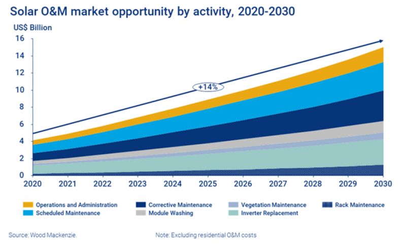 伍德麥肯茲發(fā)布最新研究報告Global solar PV operations and maintenance (O&M) economics market report 2021(《2021年全球光伏運維市場經(jīng)濟性研究》,預計至2030年,全球非住宅光伏電站的運營和維護(O&M)支出將達到150億美元,較2020年的水平增加三倍。光伏項目的競標價格日益激烈,加之勞動力和供應鏈成本上升,運維服務供應商或將面臨盈利挑戰(zhàn)。
