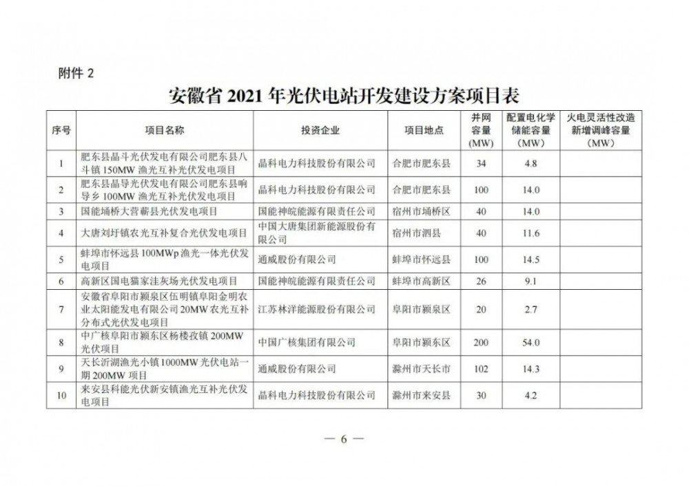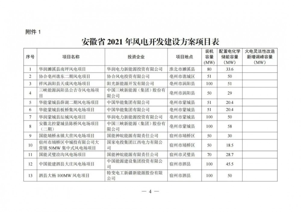 12月6日,安徽省能源局關(guān)于印發(fā)2021年風(fēng)電、光伏發(fā)電開發(fā)建設(shè)方案的通知。其中,光伏并網(wǎng)容量4574MW,要求配置電化學(xué)儲能容量961.5 MW,火電靈活性改造新增調(diào)峰容量619.6MW。風(fēng)電裝機容量1426MW,要求配置電化學(xué)儲能容量600.4 MW,火電靈活性改造新增調(diào)峰容量349.7MW。且規(guī)定電化學(xué)儲能電站連續(xù)儲能時長為1小時。