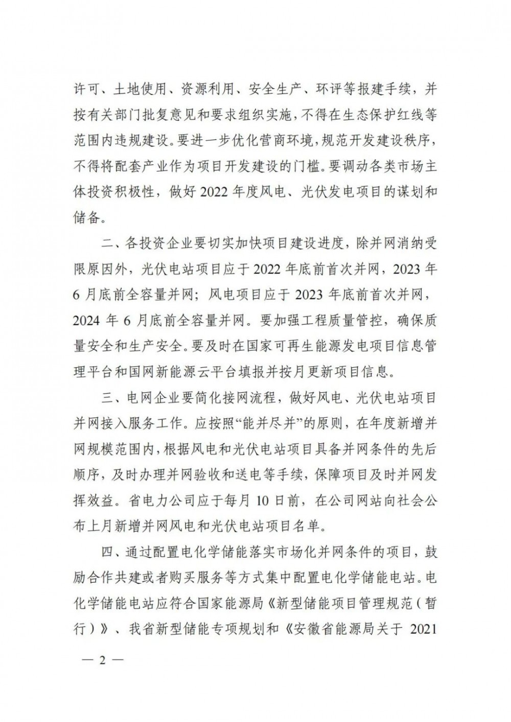 此外,安徽省要求各投資企業(yè)要切實加快項目建設(shè)進(jìn)度,除并網(wǎng)消納受限原因外,光伏電站項目應(yīng)于2022年底前首次并網(wǎng),2023年6月底前全容量并網(wǎng);風(fēng)電項目應(yīng)于2023年底前首次并網(wǎng),2024年6月底前全容量并網(wǎng)。