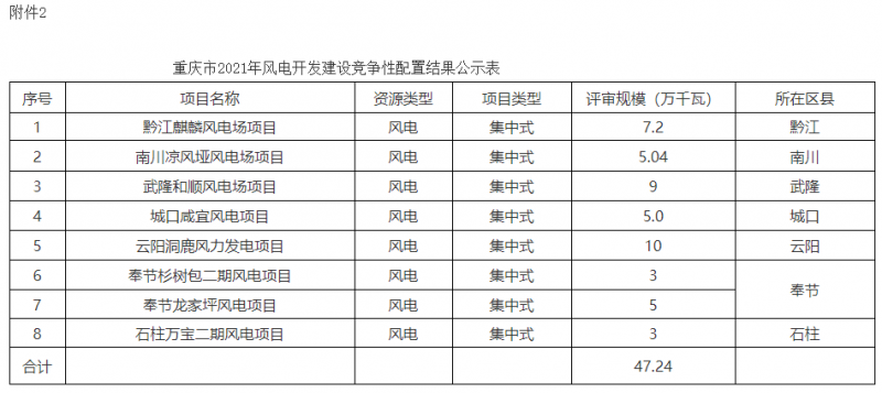 2.重慶市2021年風電開發(fā)建設競爭性配置結果公示表