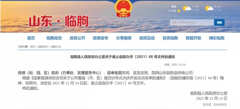 根據(jù)《國家能源局綜合司關(guān)于公布整縣(市、區(qū))屋頂分布式光伏開發(fā)試點(diǎn)名單的通知》(國能綜通新能〔2021〕84 號)精神,經(jīng)研究,決定自 2021 年 12 月 14 日起,廢止臨政辦字〔2021〕88 號文件。
