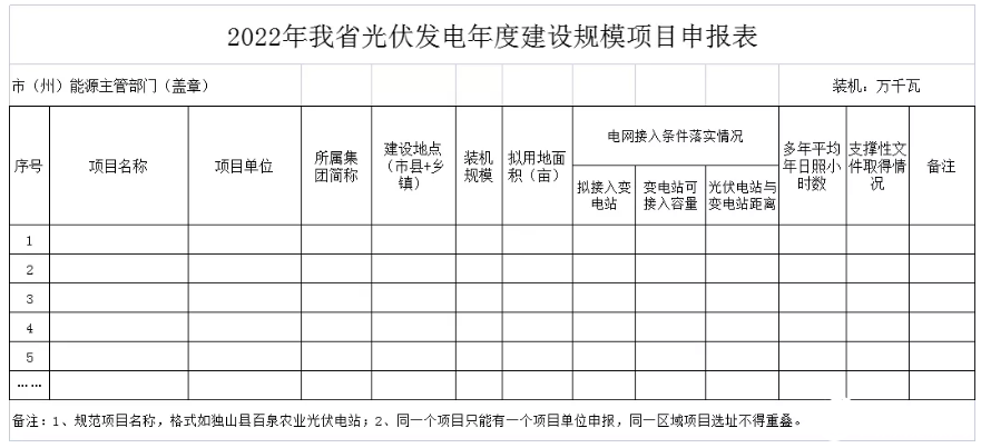 為積極貫徹落實國家“碳達(dá)峰、碳中和”工作目標(biāo),實現(xiàn)我省能源產(chǎn)業(yè)轉(zhuǎn)型、高質(zhì)量發(fā)展,有序推進(jìn)新能源項目建設(shè),根據(jù)《貴州省風(fēng)電光伏發(fā)電項目管理暫行辦法》,現(xiàn)開展我省2022年風(fēng)電光伏發(fā)電年度建設(shè)規(guī)模項目申報工作,有關(guān)事項通知如下: