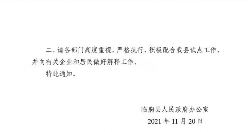 二、請各部門高度重視,嚴(yán)格執(zhí)行,積極配合我縣試點工作,并向有關(guān)企業(yè)和居民做好解釋工作。