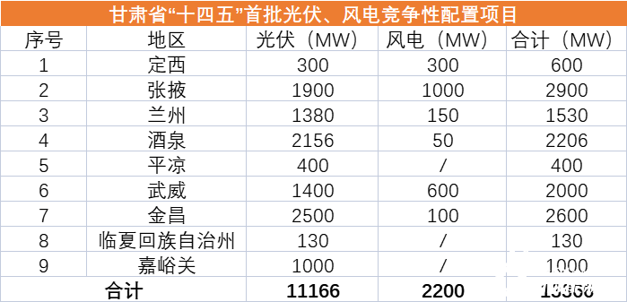 近日,記者對甘肅“十四五”首批風(fēng)光競配項目做了統(tǒng)計,相比于此前的統(tǒng)計,本次梳理規(guī)模共計13.366GW,其中光伏11.166GW,風(fēng)電2.2GW。