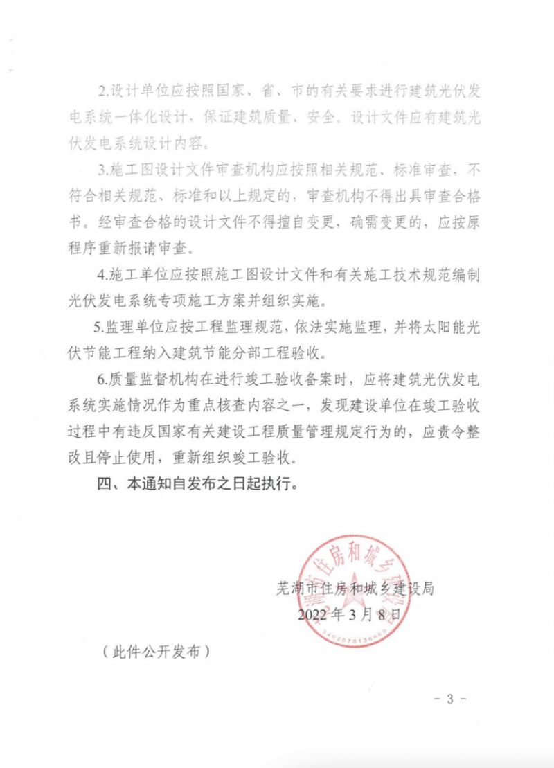 3月10日,安徽蕪湖市住建局發(fā)布關(guān)于加快建設(shè)領(lǐng)域光伏發(fā)電推廣應(yīng)用的通知,通知指出,全市范圍內(nèi)新建、改建、擴(kuò)建的工業(yè)和民用建筑項目屋面應(yīng)按光伏發(fā)電、光伏與建筑一體化設(shè)計、建造。其中,工業(yè)建筑單體屋頂面積1000平方米以上應(yīng)同步安裝光伏發(fā)電系統(tǒng),太陽發(fā)電組件面積不少于屋頂面積的70%。