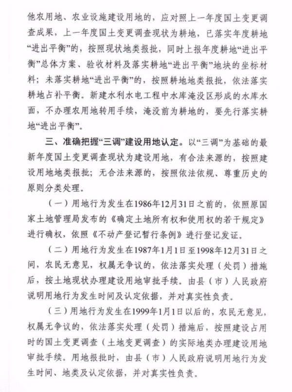 3月9日,自然資源部辦公廳印發(fā)《關(guān)于以"三調(diào)"成果為基礎(chǔ)做好建設(shè)用地審查報(bào)批地類認(rèn)定的通知》,自4月15日起實(shí)施。《通知》明確了建設(shè)用地審查報(bào)批時地類認(rèn)定規(guī)則。對報(bào)批時現(xiàn)狀為建設(shè)用地的,應(yīng)根據(jù)其來源合法性進(jìn)行分類處理。有合法來源的,按照建設(shè)用地地類報(bào)批;無合法來源的,按照建設(shè)占用時的國土變更調(diào)查(土地變更調(diào)查)的實(shí)際地類報(bào)批,地類為耕地的,應(yīng)依法落實(shí)耕地占補(bǔ)平衡。