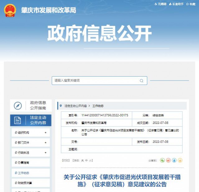 7月8日,廣東省肇慶市發(fā)改局發(fā)布關(guān)于公開(kāi)征求《肇慶市促進(jìn)光伏項(xiàng)目發(fā)展若干措施》(征求意見(jiàn)稿)意見(jiàn)建議的公告。