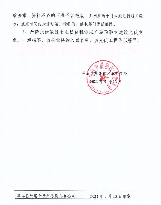 近日,江西省贛州市尋烏縣發(fā)改委印發(fā)《關于規(guī)范戶用分布式光伏發(fā)電項目建設的補充通知》,通知明確提出嚴禁光伏能源企業(yè)私自租賃農戶屋頂形式建設光伏電源。一經核實,該企業(yè)將納入黑名單,該光伏工程予以解網。