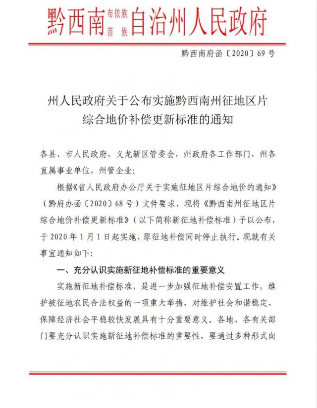 根據(jù)《州人民政府關(guān)于公布實(shí)施黔西南州征地區(qū)片綜合地價(jià)補(bǔ)償更新標(biāo)準(zhǔn)的通知》(黔西南府函〔2020〕69號(hào))補(bǔ)償標(biāo)準(zhǔn)執(zhí)行。