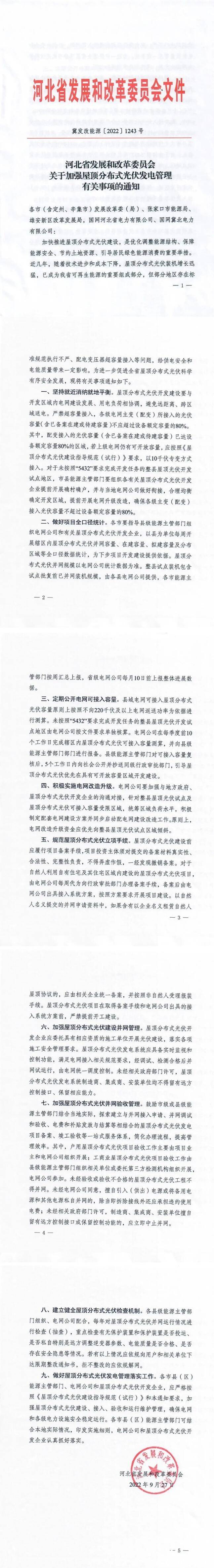 9月27日,河北省發(fā)改委發(fā)布《關(guān)于加強屋頂分布式光伏發(fā)電管理有關(guān)事項的通知》,通知指出,部分地區(qū)存在標準規(guī)范執(zhí)行不嚴、配電變壓器超容量接入等問題,給供電安全和電能質(zhì)量帶來一定影響。為進一步促進全省屋頂分布式光伏科學有序安全發(fā)展,通知提出: