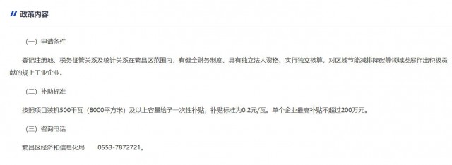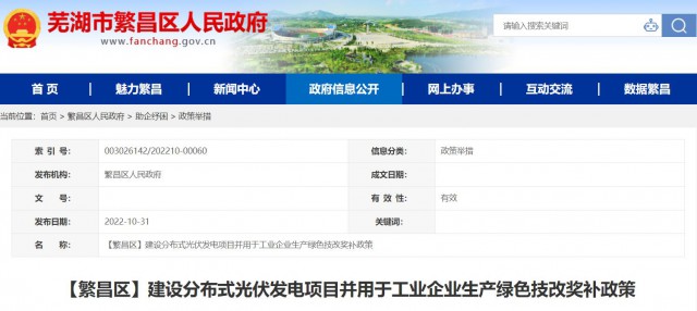 10月31日,安徽省蕪湖市繁昌區(qū)發(fā)布《建設(shè)分布式光伏發(fā)電項目并用于工業(yè)企業(yè)生產(chǎn)綠色技改獎補(bǔ)政策》,對“登記注冊地、稅務(wù)征管關(guān)系及統(tǒng)計關(guān)系在繁昌區(qū)范圍內(nèi),有健全財務(wù)制度、具有獨立法人資格、實行獨立核算,對區(qū)域節(jié)能減排降碳等領(lǐng)域發(fā)展作出積極貢獻(xiàn)的規(guī)上工業(yè)企業(yè)”進(jìn)行政策獎補(bǔ)。