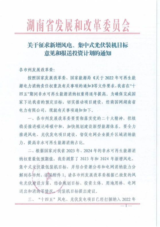 11月10日,湖南省發(fā)改委下發(fā)《關(guān)于征求新增風(fēng)電、集中式光伏裝機目標意見和報送投資計劃的通知》?!锻ㄖ分赋?,根據(jù)國家對湖南省2023年、2024年的非水可再生能源消納權(quán)重最低預(yù)期值,湖南發(fā)改委測算了2023年和2024年新增風(fēng)電、集中式光伏最低裝機目標,并結(jié)合資源分布和電網(wǎng)消納能力分解到各市州。其中,2023年湖南新增風(fēng)電規(guī)模為225萬千瓦,新增光伏裝機規(guī)模為340萬千瓦;2024年湖南新增風(fēng)電規(guī)模為330萬千瓦,新增光伏裝機規(guī)模為300萬千瓦。