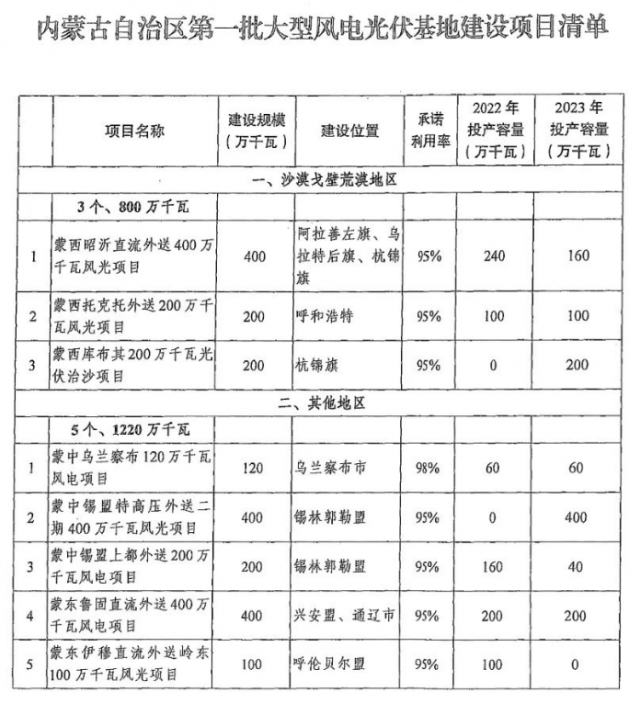 根據(jù)此前公開(kāi)信息顯示,第一批風(fēng)光大基地總規(guī)模約97.05GW(《總規(guī)模97.05GW!第一批大型風(fēng)、光大基地項(xiàng)目名單發(fā)布》),主要布局在內(nèi)蒙、青海、甘肅等19個(gè)省份,包括2GW魯北鹽堿灘基地、2.6GW廣西橫州基地、青海海南、海西10.9GW基地、陜五一期6GW外送基地、渭南3.53GW基地、內(nèi)蒙古2GW光伏治沙……等等均已悉數(shù)開(kāi)工。其中,內(nèi)蒙古第一批8個(gè)國(guó)家大型風(fēng)電光伏基地項(xiàng)目共計(jì)2020萬(wàn)千瓦。