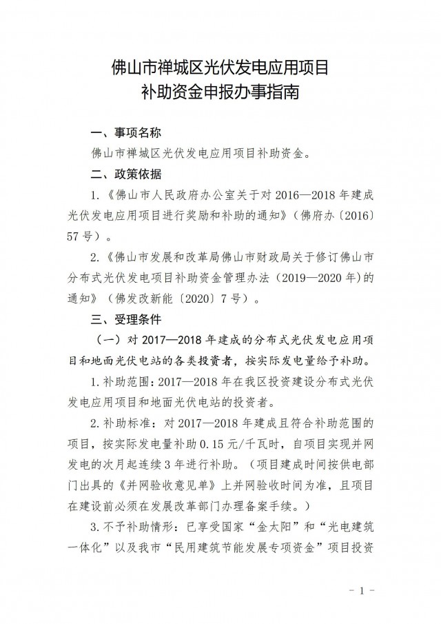 近日,佛山市禪城區(qū)發(fā)展和改革局印發(fā)《關于開展2021年度禪城區(qū)光伏發(fā)電應用項日補助資金申報工作的通知》。
