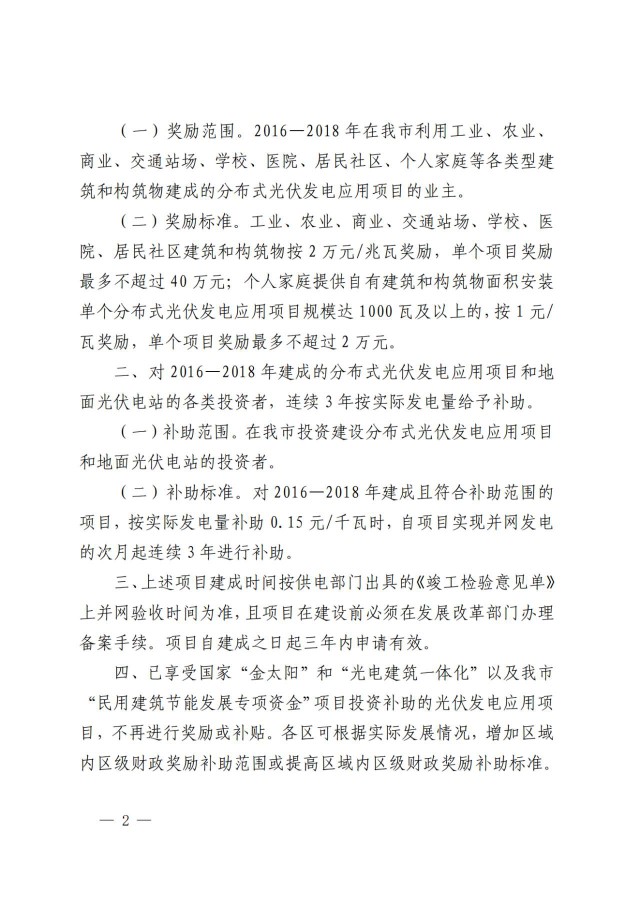 項目自建成并網(wǎng)的次月起連續(xù)補助36個月,其中:2017一2018年建成并網(wǎng)的分布式光伏發(fā)電項目,按實際發(fā)電量補助0.15元/千瓦時;2019-2020年建成并網(wǎng)的分布式光伏發(fā)電項目,按實際發(fā)電量補助0.3元/千瓦時。