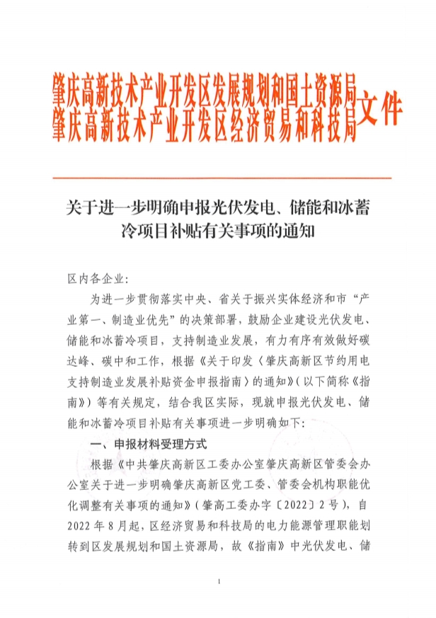為進(jìn)一步貫徹落實(shí)中央、省關(guān)于振興實(shí)體經(jīng)濟(jì)和市“產(chǎn)業(yè)第一、制造業(yè)優(yōu)先”的決策部署,鼓勵(lì)企業(yè)建設(shè)光伏發(fā)電、儲(chǔ)能和冰蓄冷項(xiàng)目,支持制造業(yè)發(fā)展,有力有序有效做好碳達(dá)峰、碳中和工作,根據(jù)《關(guān)于印發(fā)〈肇慶高新區(qū)節(jié)約用電支持制造業(yè)發(fā)展補(bǔ)貼資金申報(bào)指南〉的通知》(以下簡稱《指南》)等有關(guān)規(guī)定,結(jié)合我區(qū)實(shí)際,現(xiàn)就申報(bào)光伏發(fā)電、儲(chǔ)能和冰蓄冷項(xiàng)目補(bǔ)貼有關(guān)事項(xiàng)進(jìn)一步明確如下: