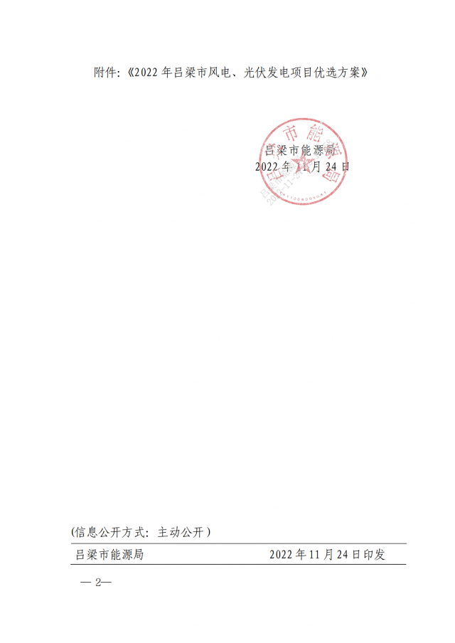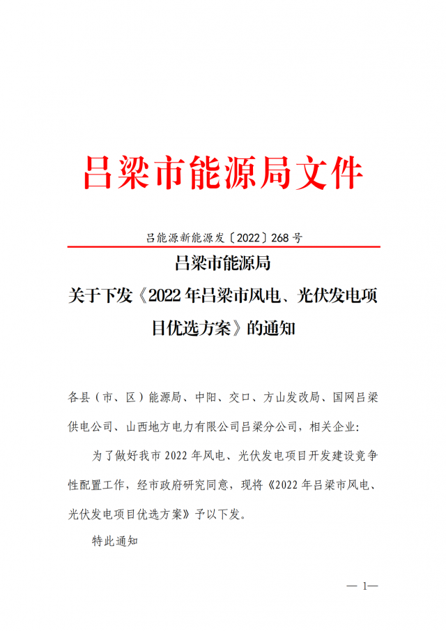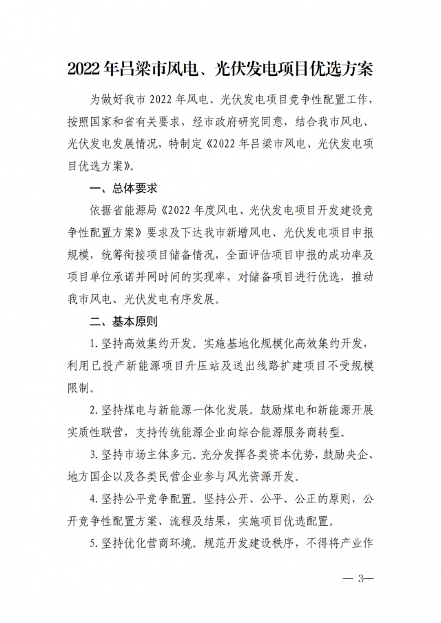 近日,山西呂梁市能源局發(fā)布關(guān)于《2022年呂梁市風電、光伏發(fā)電項目優(yōu)選方案》的通知。