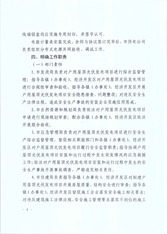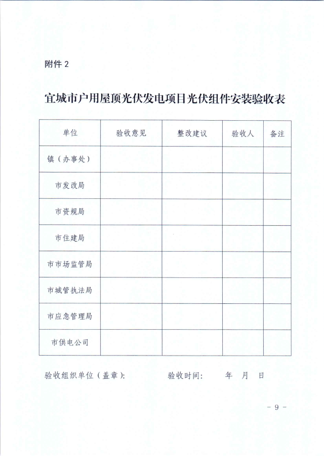 屋頂光伏在組件安裝完成后,業(yè)主需向?qū)俚劓?zhèn)、經(jīng)濟(jì)開發(fā)區(qū)提出驗(yàn)收申請,然后會同市發(fā)改局、自然資源和規(guī)劃局、住建局、市場監(jiān)管局、城管執(zhí)法局、應(yīng)急管理局、供電公司等部門聯(lián)合驗(yàn)收并出具驗(yàn)收意見。
