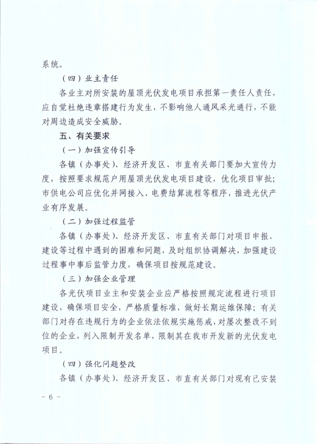 近日,湖北宜城發(fā)布《關(guān)于進(jìn)一步規(guī)范宜城市戶用屋頂光伏發(fā)電項(xiàng)目建設(shè)的通知》,明確指出全市所有學(xué)校、醫(yī)院、政府投資標(biāo)準(zhǔn)廠房、辦公樓等國有和集體權(quán)屬房屋,未經(jīng)批準(zhǔn)不得擅自實(shí)施屋頂光伏發(fā)電項(xiàng)目,而戶用光伏項(xiàng)目并網(wǎng)需要8個(gè)部門的簽字。