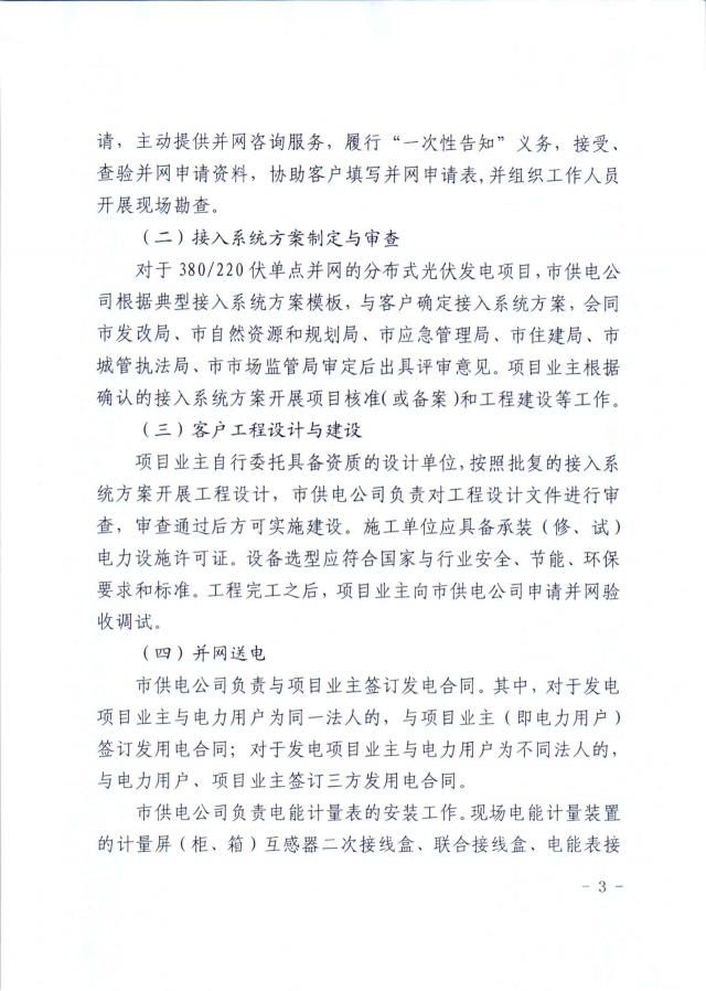 并網(wǎng)方面,則是對于380/220伏單點(diǎn)并網(wǎng)的分布式光伏發(fā)電項(xiàng)目,市供電公司根據(jù)典型接入系統(tǒng)方案模板,與客戶確定接入系統(tǒng)方案,會同市發(fā)改局、市自然資源和規(guī)劃局、市應(yīng)急管理局、市住建局、市城管執(zhí)法局、市市場監(jiān)管局審定后出具評審意見。項(xiàng)目業(yè)主根據(jù)確認(rèn)的接入系統(tǒng)方案開展項(xiàng)目核準(zhǔn)(或備案)和工程建設(shè)等工作。