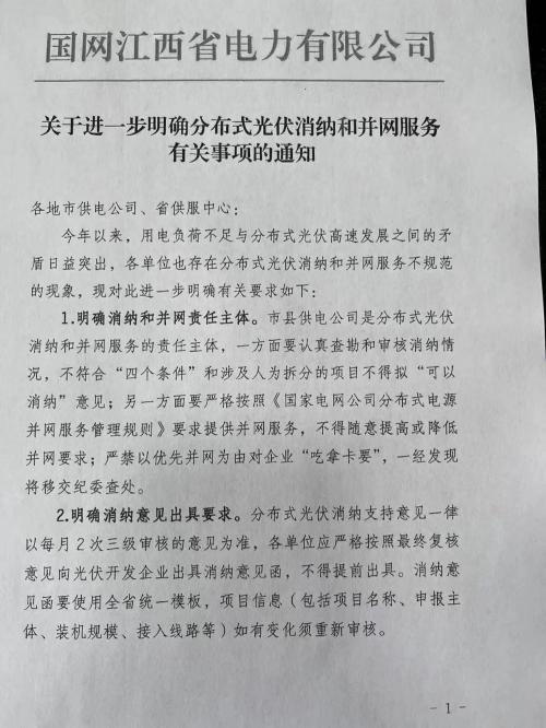 日前,國網(wǎng)江西省下發(fā)《關(guān)于進(jìn)一步明確分布式光伏消納和并網(wǎng)服務(wù)有關(guān)事項的通知》,明確要求紅色預(yù)警地區(qū)暫停戶用光伏并網(wǎng),企業(yè)租用屋頂開發(fā)的戶用光伏按非自然人管理或暫停接入,任何項目未經(jīng)三級審核均不得出具消納意見。