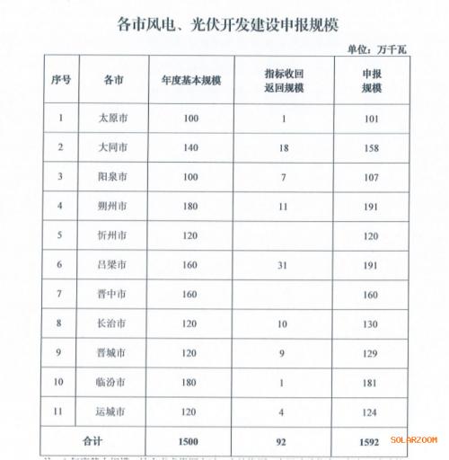 本次優(yōu)選擬擬安排風電、光伏保障性并網(wǎng)規(guī)模1500萬千瓦,返回規(guī)模92萬千瓦,合計1592萬千瓦。需要注意的是,晉北采煤沉陷區(qū)6GW新能源基地涉及的6區(qū)縣不再布局省內自用保障性并網(wǎng)光伏發(fā)電項目,但其土地資源優(yōu)先保障晉北新能源基地光伏發(fā)電項目。各市擬安排規(guī)模見下: