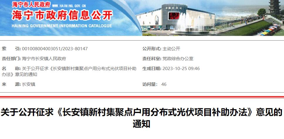 為深入貫徹落實(shí)上級(jí)關(guān)于共同富裕和“碳達(dá)峰、碳中和”的一系列決策部署,根據(jù)《海寧市“萬(wàn)戶光伏 綠色共富”行動(dòng)實(shí)施方案(試行)》文件精神,為加快統(tǒng)籌推進(jìn)全鎮(zhèn)新村集聚點(diǎn)戶用分布式光伏項(xiàng)目建設(shè),特制《長(zhǎng)安鎮(zhèn)新村集聚點(diǎn)戶用分布式光伏項(xiàng)目補(bǔ)助辦法》?,F(xiàn)公開(kāi)征求意見(jiàn),如有意見(jiàn)和建議,請(qǐng)于11月24日前反饋至長(zhǎng)安鎮(zhèn)。