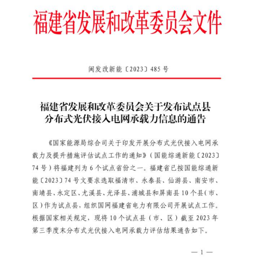 11月20日,福建省發(fā)展和改革委員會(huì)發(fā)布《關(guān)于發(fā)布試點(diǎn)縣分布式光伏接入電網(wǎng)承載力信息的通告》(下稱《通告》)。