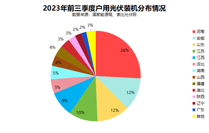 光伏發(fā)電方面,2023年前三季度,光伏新增裝機(jī)12894萬(wàn)千瓦(128.94GW),同比增長(zhǎng)145%,其中集中式光伏6180萬(wàn)千瓦(61.8GW),分布式光伏6714萬(wàn)千瓦(67.14GW),分布式光伏占比超過(guò)52%。分地區(qū)看,河南、山東、江蘇、湖北等11個(gè)省(自治區(qū)),前三季度光伏發(fā)電新增裝機(jī)超過(guò)5GW,其中7省的分布式光伏占比都超過(guò)一半。最高的河南省,分布式光伏占比超過(guò)98.6%,成為名副其實(shí)的“分布式光伏發(fā)展熱土”。