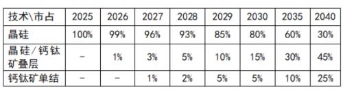 樂觀預(yù)計,2025年前晶硅/鈣鈦礦疊層技術(shù)將有量產(chǎn)及示范應(yīng)用,組件效率將超過晶硅;到2027年,晶硅/鈣鈦礦疊層將有規(guī)?;瘧?yīng)用,組件效率將超過30%;到2030年,晶硅/鈣鈦礦疊層技術(shù)將大規(guī)模部署。