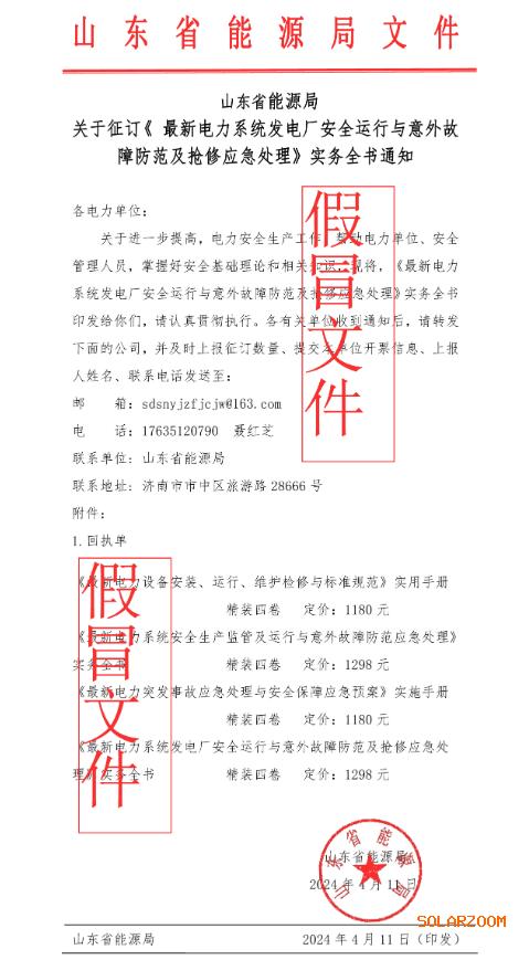近日,我局接到舉報(bào)反映,有不法分子冒用我局名義,發(fā)布《山東省能源局關(guān)于征訂<最新電力系統(tǒng)發(fā)電廠安全運(yùn)行與意外故障防范及搶修應(yīng)急處理>實(shí)務(wù)全書通知》,推銷《<最新電力系統(tǒng)設(shè)備安裝、運(yùn)行、維護(hù)檢修與標(biāo)準(zhǔn)規(guī)范>實(shí)用手冊》《<最新電力系統(tǒng)安全生產(chǎn)監(jiān)管及運(yùn)行與意外故障防范應(yīng)急處理>實(shí)務(wù)全書》《<最新電力突發(fā)事故應(yīng)急處理與安全保障應(yīng)急預(yù)案>實(shí)施手冊》《<最新電力系統(tǒng)發(fā)電廠安全運(yùn)行與意外故障防范及搶修應(yīng)急處理>實(shí)務(wù)全書》等書籍。