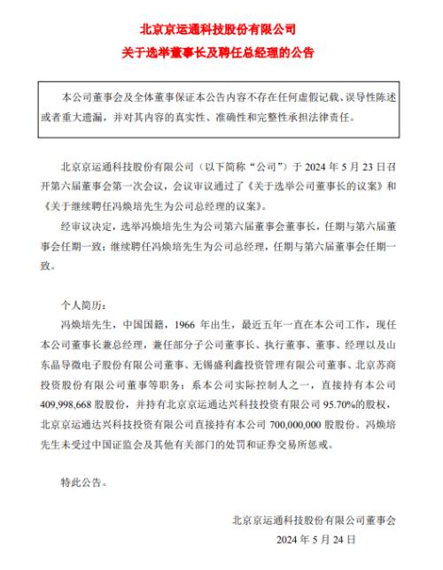 馮煥培繼續(xù)擔(dān)任京運(yùn)通董事長、總經(jīng)理!