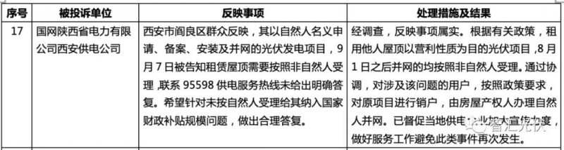 通報(bào)顯示:西安市閻良區(qū)群眾反映,其以自然人名義申請(qǐng)、備案、安裝及并網(wǎng)的光伏發(fā)電項(xiàng)目,9月7日被告知租賃屋頂需要按照非自然人受理,聯(lián)系95598供電服務(wù)熱線未給出明確答復(fù)。希望針對(duì)未按自然人受理給其納入國家財(cái)政補(bǔ)貼規(guī)模問題,做出合理答復(fù)。