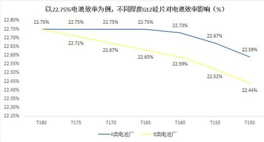 硅片減薄對(duì)效率有一定的影響,對(duì)此,中環(huán)股份提出測算。以22.75%電池效率為例,不同厚度G12硅片對(duì)電池效率影響是,A類電池廠商的生產(chǎn)條件下,應(yīng)用160μm硅片的電池的效率,比175μm的低0.02%。