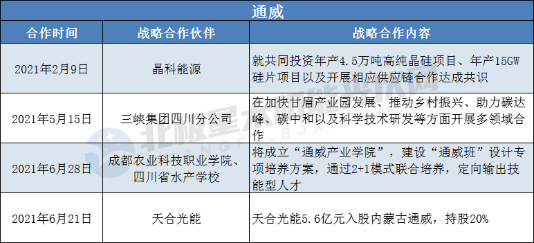 據(jù)北極星太陽(yáng)能光伏網(wǎng)不完全統(tǒng)計(jì),2021年初至今,已有晶科、通威、晶澳、特變電工、天合光能5家光伏企業(yè)在通過(guò)增資入股、合資擴(kuò)產(chǎn)形式成為深度戰(zhàn)略合作伙伴。