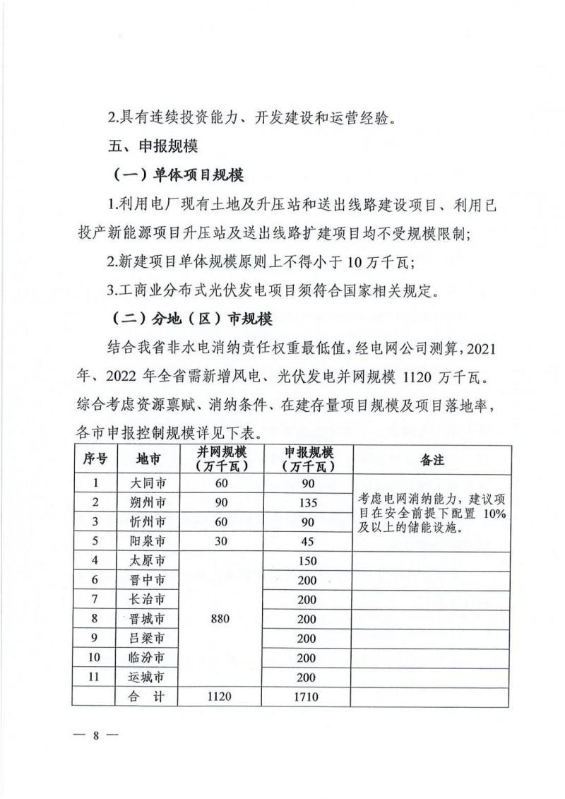結(jié)合山西省非水電消納責(zé)任權(quán)重最低值,經(jīng)電網(wǎng)公司測算,2021年、2022年山西省需新增風(fēng)電、光伏發(fā)電并網(wǎng)規(guī)模1120萬千瓦。文件明確晉北三市暫不考慮風(fēng)電競配項目,其余地市風(fēng)光發(fā)電項目規(guī)模按2:8比例申報。